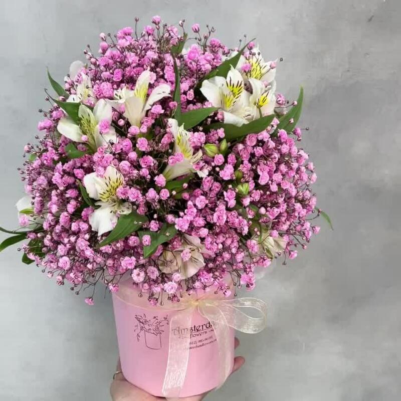 Альстромерия – 5 шт.Гипсофила розовая – 3 шт.Коробка d12 – 1 шт.Оазис – 1 шт.