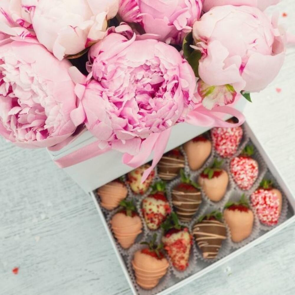 Шкатулка с пионами и клубникой в бельгийском шоколаде