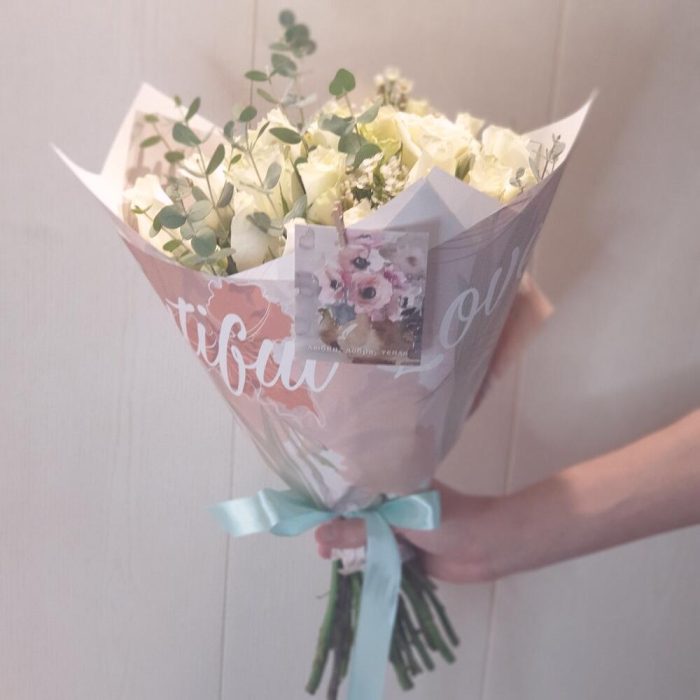 Лента атласная – 1 шт.Открыточка с вашими пожеланиями – 1 шт.Роза кенийская 50 см – 25 шт.Хамелациум белый – 2 шт.Эвкалипт Baby Blue – 5 шт.упаковка дизайнерская бумага – 2 шт.