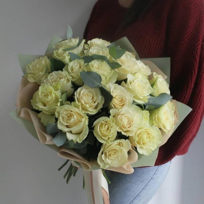25 белых роз с шикарным эвкалиптом