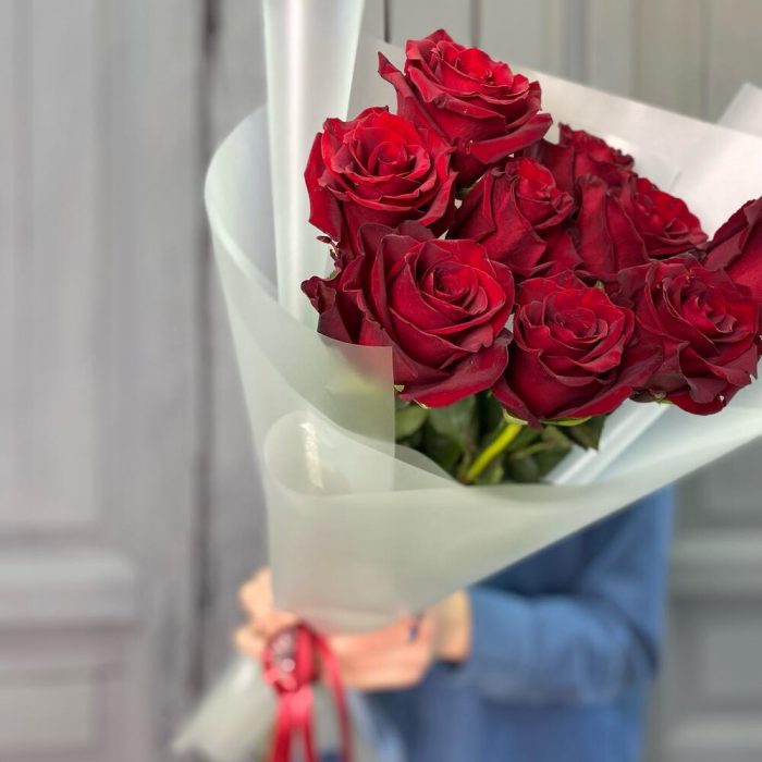 Роза красная Эквадор – 9 шт.Упаковка дизайнерская – 2 шт.Лента атласная – 2 шт.