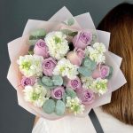 Роза одноголовая – 9 шт.Маттиола – 7 шт.Эвкалипт – 5 шт.бумага дизайнерская – 5 шт.Лента атласная – 1 шт.