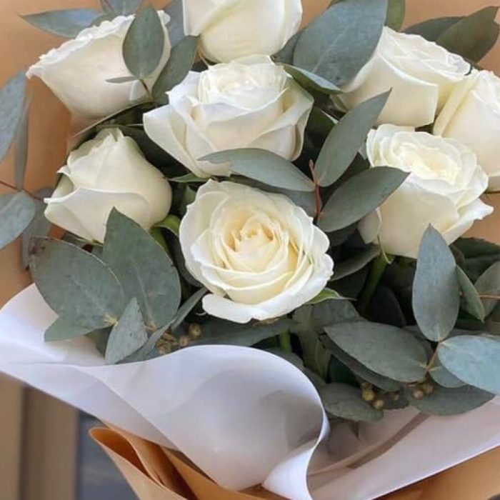 Шикарный букет из белых роз с эвкалиптом в шикарной упаковке