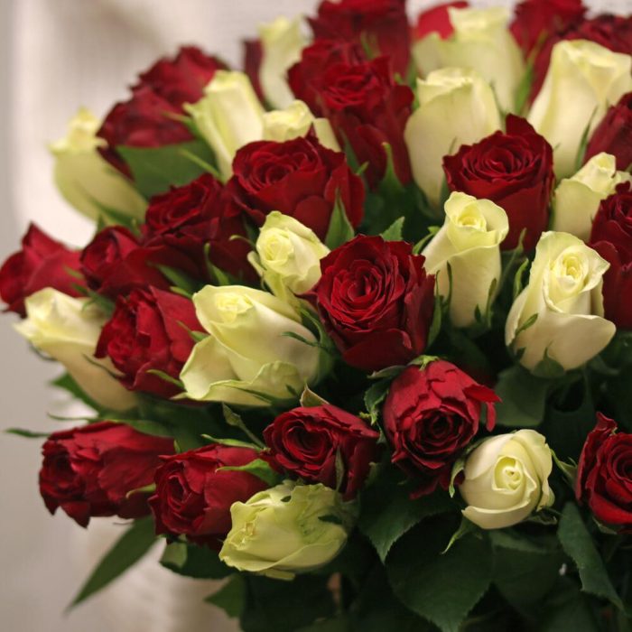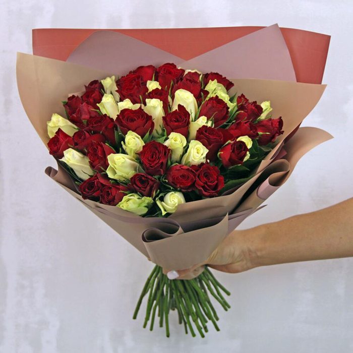 Букет из 51 красной и белой розы микс 35-40 см (Кения) в стильной упаковке