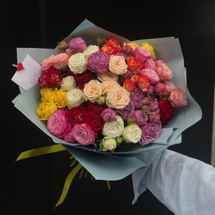 Пионовидная кустовая роза – 15 шт. Открыточка с вашими пожеланиями – 1 шт. Упаковка дизайнерская – 1 шт. инструкция по уходу за цветами – 1 шт.