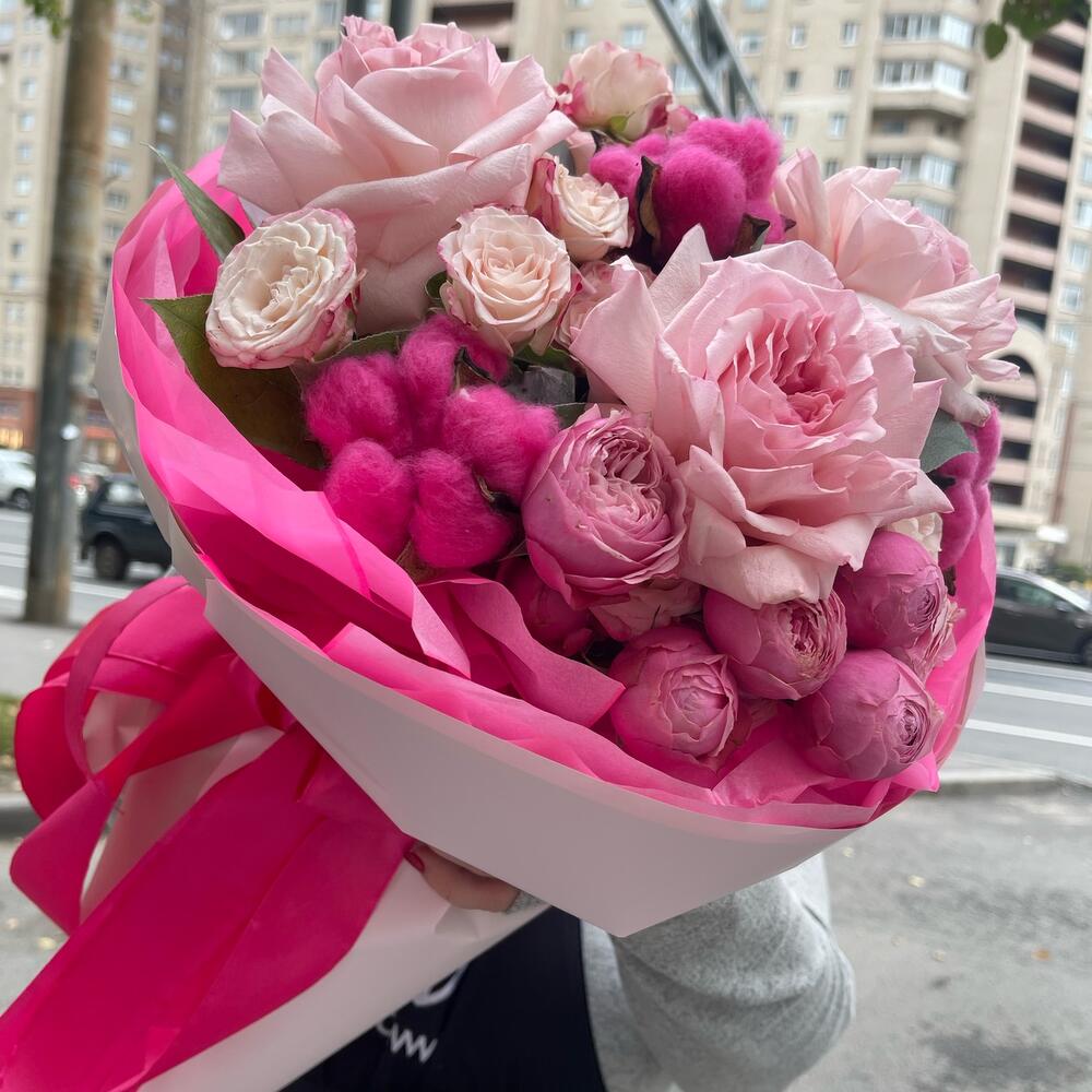 white o’hara – 3 шт.Кустовая роза – 7 шт.Пионовидная роза – 2 шт.Хлопок натуральный – 3 шт.Салал – 5 шт.Тишью – 4 шт.Пленка матовая – 1 шт.Лента атласная – 2 шт.