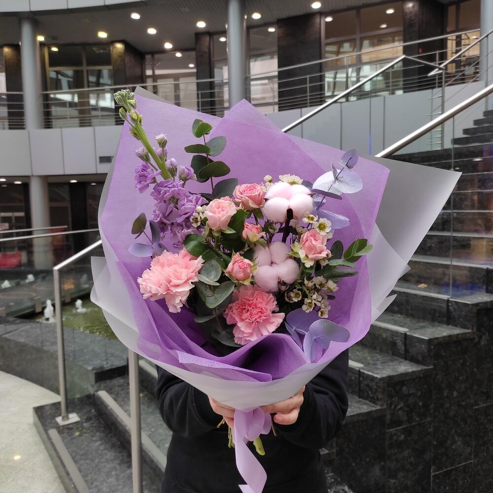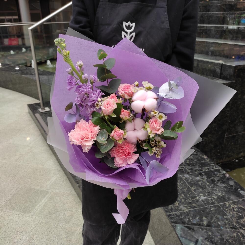 Роза кустовая – 1 шт.Диантус – 2 шт.Хлопок – 2 шт.Маттиола – 1 шт.Эвкалипт – 1 шт.Ваксфлауэр – 1 шт.Лента – 2 шт.Упаковка дизайнерская – 2 шт.