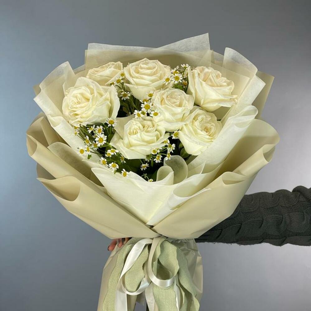Лента – 2 шт.Роза – 7 шт.Матрикария – 5 шт.бумага упаковочная – 2 шт.
