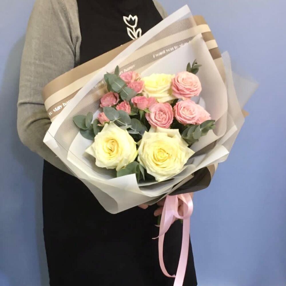 роза пионовидная candelight – 3 шт.Роза кустовая пионовидная – 2 шт.Эвкалипт – 5 шт.Упаковка дизайнерская – 2 шт.Лента атласная – 1 шт.
