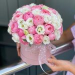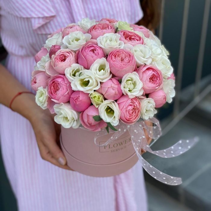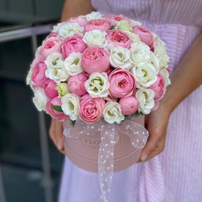 Композиция из кустовых пионовидных роз и белой эустомы в коробке !
