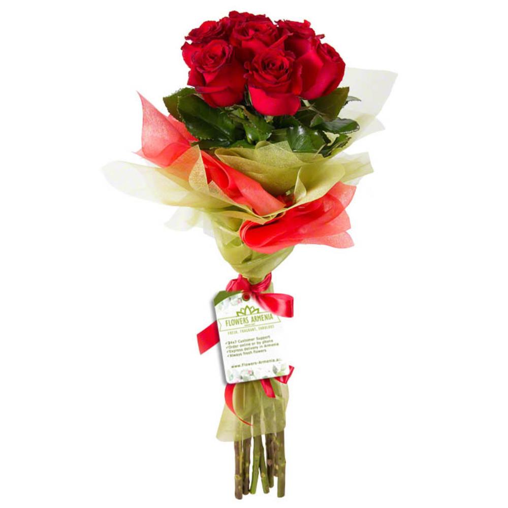 Bouquet of 9 red Dutch roses "Explorer" wrapped in green and red felt. The height of the stem is 60 cm.