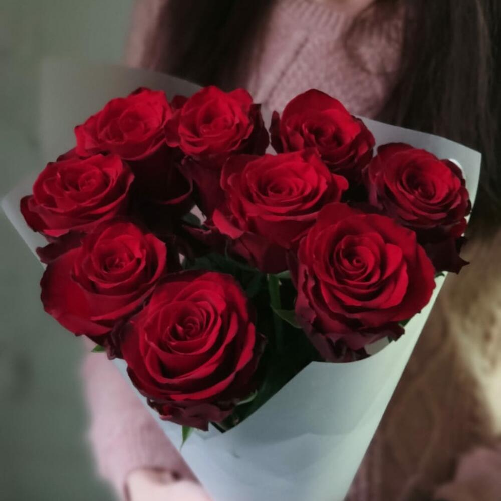 9 классических роз сорта Explorer (Эксплорер) в моно-букетеСорт отличается насыщенным бордовым оттенком бутона и стойкостьюБукет оформлен упаковкой и атласными лентами