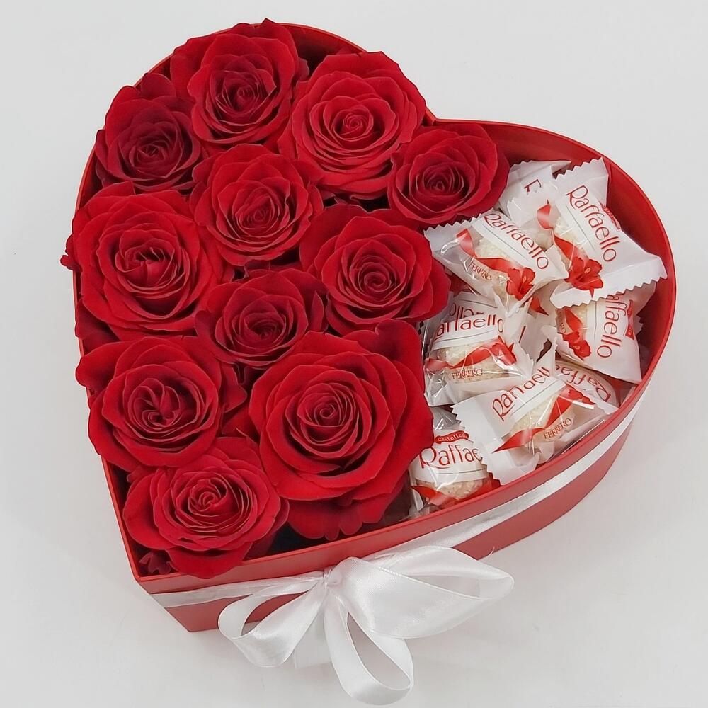 Роза Эквадор Премиум – 11 шт.Конфеты Raffaello – 150 гр.Коробка сердце – 1 шт.Лента атласная – 1 шт.Флористическая губка (оазис) – 2 шт.