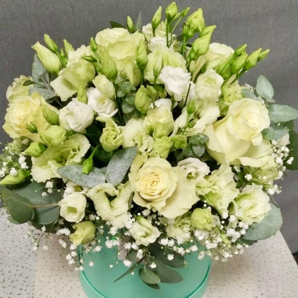 Роза белая – 5 шт.эустома green – 5 шт.Эвкалипт – 5 шт.Гипсофила – 2 шт.Шляпная коробка с лентами – 1 шт.