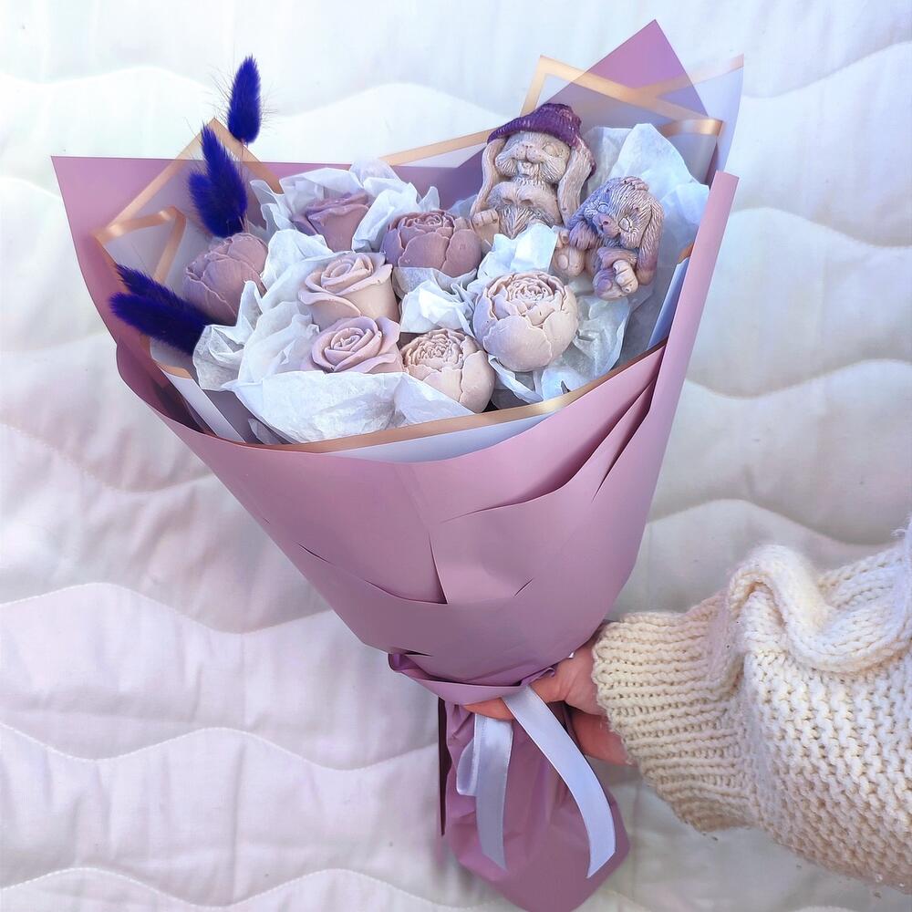 Лента атласная – 1 шт.Упаковка дизайнерская – 2 шт.Лагурус (сухоцвет) – 5 шт.белый бельгийский шоколад callebaut – 9 шт.