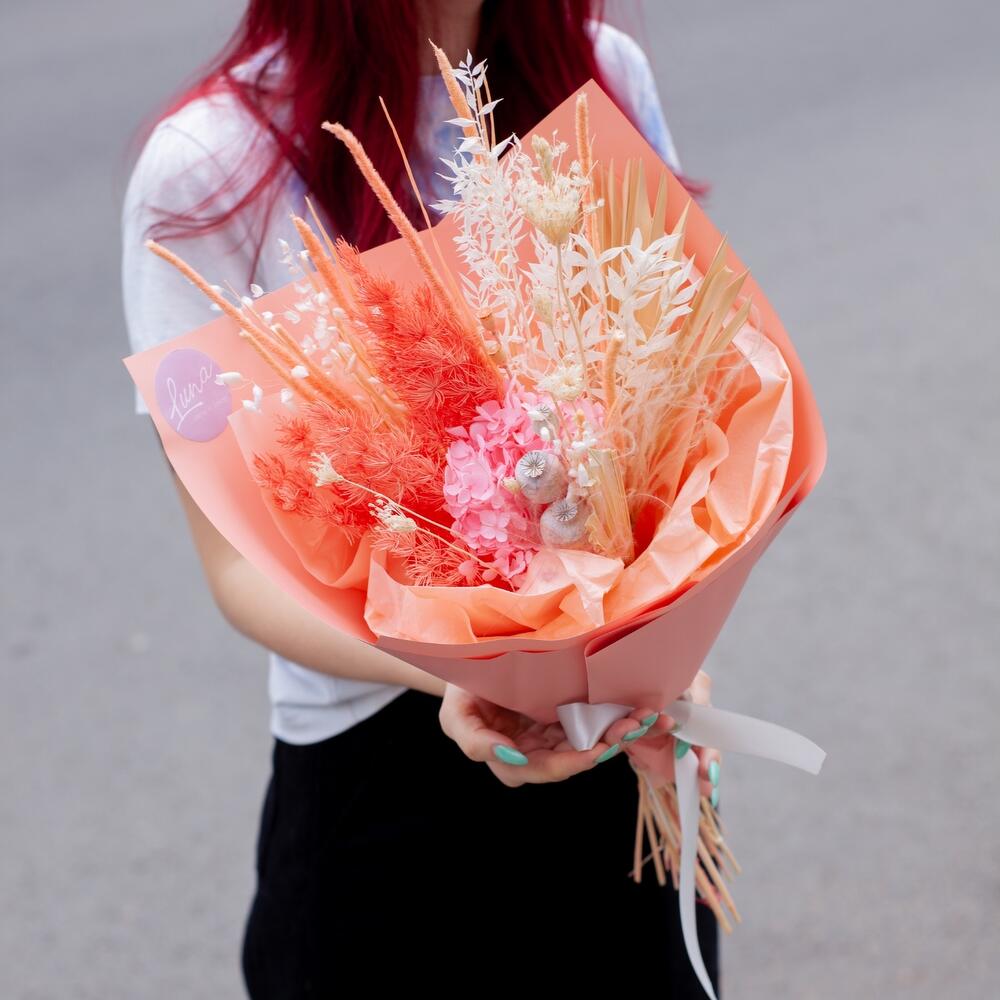 Аспарагус – 3 шт.Дизайнерская упаковка – 1 шт.флеум – 3 шт.гортензия стабилизированная – 1 шт.рускус сухоцвет – 2 шт.пальма сухоцвет – 2 шт.ковыль сухоцвет – 1 шт.мак коробка крашеный – 3 шт.