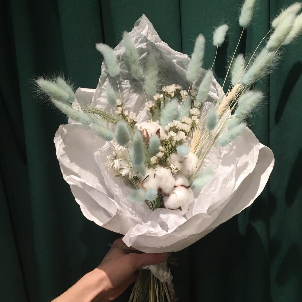 лагурус Baby Blue – 1 шт.Статица – 5 шт.Паникум – 1 шт.Хлопок – 4 шт.Упаковка дизайнерская – 1 шт.