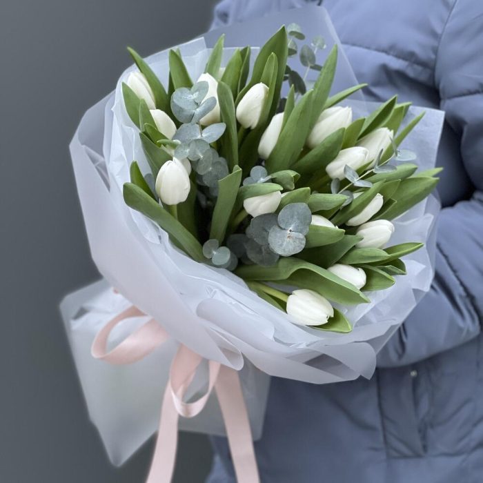 Букет из белых тюльпанов и эвкалипта в оформлении!